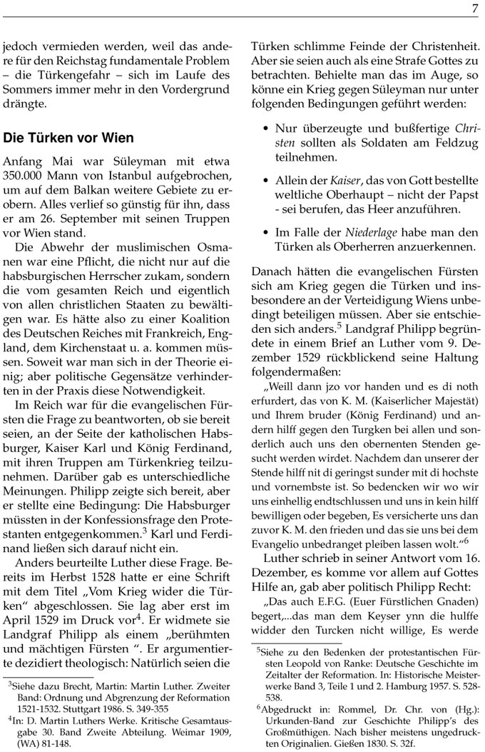 Danach hätten die evangelischen Fürsten sich am Krieg gegen die Türken und insbesondere an der Verteidigung Wiens unbedingt beteiligen müssen. Aber sie entschieden sich anders.5 Landgraf Philipp begründete in einem Brief an Luther vom 9. Dezember 1529 rückblickend seine Haltung folgendermaßen: