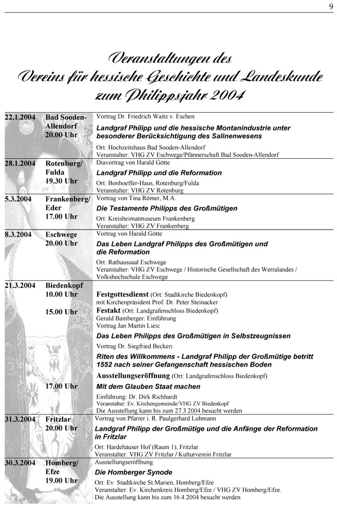 Veranstaltungen des Vereins für hessische Geschichte und Landeskunde zum Philippsjahr 2004
