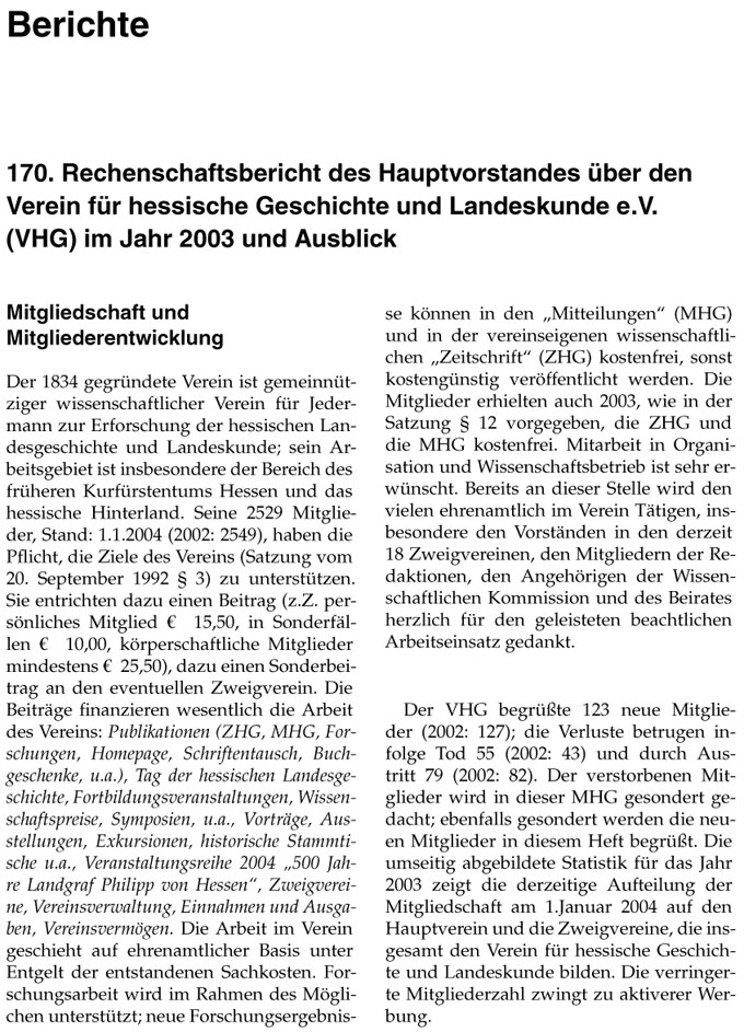 170. Rechenschaftsbericht des Hauptvorstandes über den Verein für hessische Geschichte und Landeskunde e.V. (VHG) im Jahr 2003 und Ausblick
