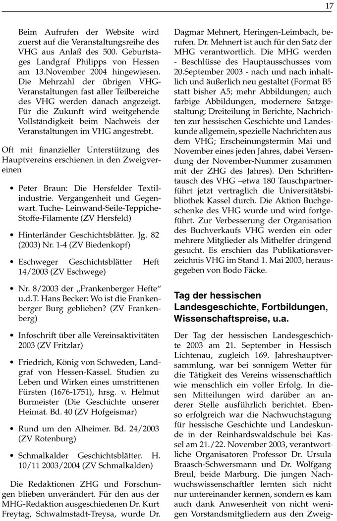 Die Redaktionen ZHG und Forschungen blieben unverändert. Für den aus der MHGRedaktion ausgeschiedenen Dr. Kurt Freytag, SchwalmstadtTreysa, wurde Dr. Dagmar Mehnert, HeringenLeimbach, berufen. Dr. Mehnert ist auch für den Satz der MHG verantwortlich. Die MHG werden Beschlüsse des Hauptausschusses vom 20.September 2003 nach und nach inhaltlich und äußerlich neu gestaltet (Format B5 statt bisher A5; mehr Abbildungen; auch farbige Abbildungen, modernere Satzgestaltung; Dreiteilung in Berichte, Nachrichten zur hessischen Geschichte und Landeskunde allgemein, spezielle Nachrichten aus dem VHG; Erscheinungstermin Mai und November eines jeden Jahres, dabei Versendung der NovemberNummer zusammen mit der ZHG des Jahres). Den Schriftentausch des VHG –etwa 180 Tauschpartnerführt jetzt vertraglich die Universitätsbibliothek Kassel durch. Die Aktion Buchgeschenke des VHG wurde und wird fortgeführt. Zur Verbesserung der Organisation des Buchverkaufs VHG werden ein oder mehrere Mitglieder als Mithelfer dringend gesucht. Es erschien das Publikationsverzeichnis VHG im Stand 1. Mai 2003, herausgegeben von Bodo Fäcke.