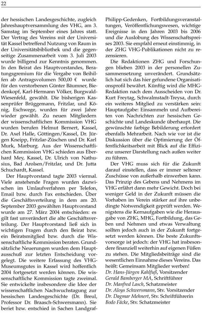 der hessischen Landesgeschichte, zugleich Jahreshauptversammlung des VHG, am 3. Samstag im September eines Jahres statt. Der Vertrag des Vereins mit der Universität Kassel betreffend Nutzung von Raum in der Universitätsbibliothek und die gegenseitige Zusammenarbeit vom 3. Juli 2003 wurde billigend zur Kenntnis genommen. In den Beirat des Hauptvorstandes, Beratungsgremium für die Vergabe von Beihilfen ab Antragsvolumen 500,00 € wurde für den verstorbenen Günter Bäumner, Biedenkopf, KarlHermann Völker, BurgwaldWiesenfeld, gewählt. Die bisherigen Kassenprüfer Brüggemann, Fritzlar, und König, Eschwege, wurden für zwei Jahre wieder gewählt. Zu neuen Mitgliedern der wissenschaftlichen Kommission VHG wurden berufen Helmut Bernert, Kassel, Dr. Axel Halle, Göttingen/Kassel, Dr. Jürgen Kneipp, FritzlarZüschen und Dr. Karl Murk, Marburg. Aus der Wissenschaftlichen Kommission VHG schieden aus Eberhard Mey, Kassel, Dr. Ulrich von Nathusius, Bad Arolsen/Fritzlar, und Dr. Jutta Schuchardt, Kassel.