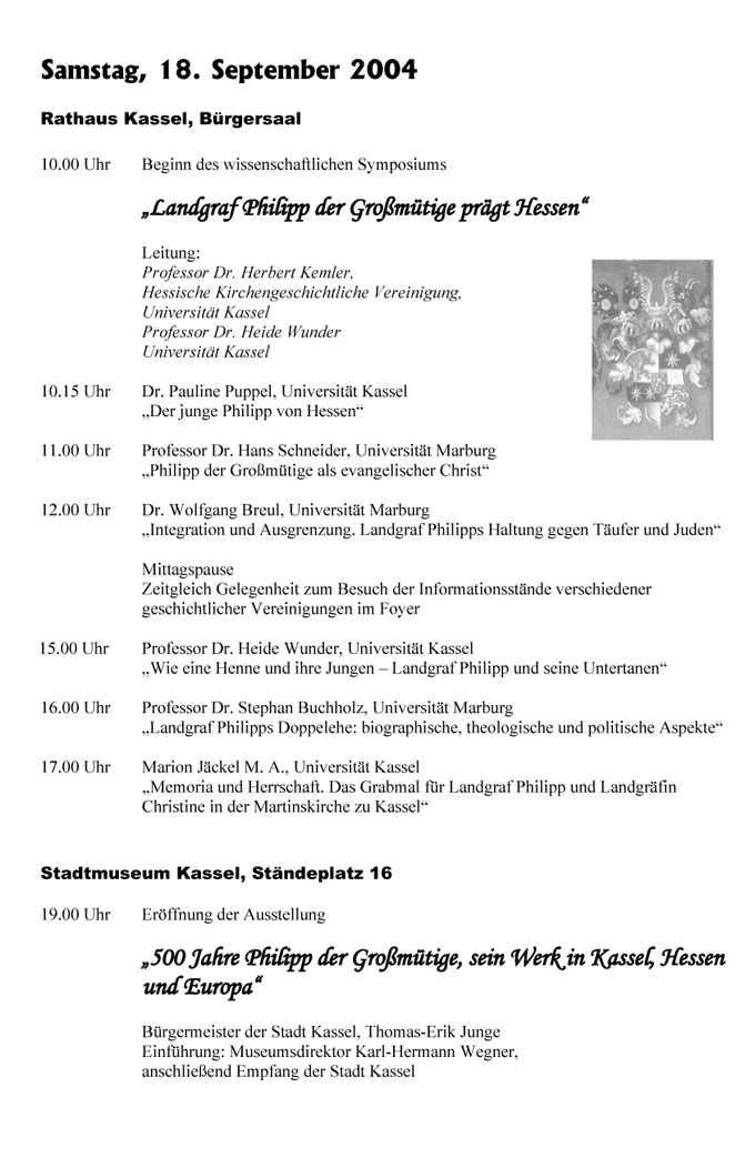 11.00 Uhr Professor Dr. Hans Schneider, Universität Marburg „Philipp der Großmütige als evangelischer Christ"