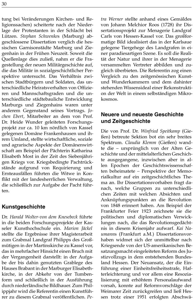 Dr. Harald Woltervon dem Knesebeck führte in die beiden Forschungsprojekte der Kasseler Kunsthochschule ein. Marion Jäckel stellte die Ergebnisse ihrer Magisterarbeit zum Grabmal Landgraf Philipps des Großmütigen in der Martinskirche zu Kassel vor, das in mehrfacher Hinsicht einen Bruch mit der Vergangenheit darstellt: in der Aufgabe der bis dahin genutzten Grablege des Hauses Brabant in der Marburger Elisabethkirche, in der Abkehr von der Tumbenform und schließlich in der Ausführung durch niederländische Bildhauer. Zum Philippjahr wird die Referentin einen Kunstführer zu diesem Grabmal veröffentlichen. Petra Werner stellte anhand eines Gemäldes von Johann Melchior Roos (1728) ihr Dissertationsprojekt zur Menagerie Landgraf Carls von HessenKassel vor. Das großformatige Bild idealisiert das in der Karlsaue gelegene Tiergehege des Landgrafen in einer paradiesartigen Szene. Es soll die Realität der Natur und ihrer in der Menagerie versammelten Vertreter abbilden und zugleich überbieten. Die Referentin zog einen Vergleich zu den zeitgenössischen Kunstund Wunderkammern und dem dahinter stehenden Wissensideal einer Rekonstruktion der Welt in einem selbständigen Mikrokosmos.