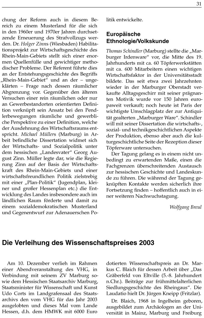 Am 10. Dezember verlieh im Rahmen einer Abendveranstaltung des VHG, in Verbindung mit seinem ZV Marburg sowie dem Hessischen Staatsarchiv Marburg, Staatsminister für Wissenschaft und Kunst Udo Corts im Landgrafensaal des Staatsarchivs den vom VHG für das Jahr 2003 ausgelobten und dieses Mal vom Lande Hessen, d.h. dem HMWK mit 6000 Euro dotierten Wissenschaftspreis an Dr. Markus C. Blaich für dessen Arbeit über „Das Gräberfeld von Eltville (5.8. Jahrhundert n.Chr.). Beiträge zur frühmittelalterlichen Siedlungsgeschichte des Rheingaus“. Die Laudatio hielt Dr. Jürgen Kneipp (Fritzlar).