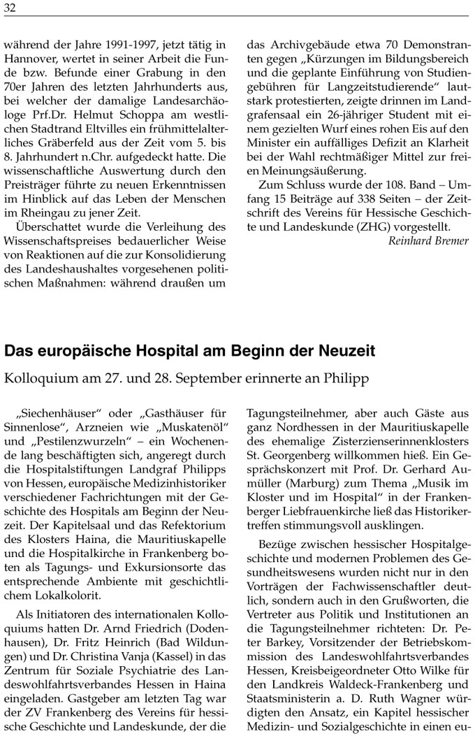 „Siechenhäuser“ oder „Gasthäuser für Sinnenlose“, Arzneien wie „Muskatenöl“ und „Pestilenzwurzeln“ – ein Wochenende lang beschäftigten sich, angeregt durch die Hospitalstiftungen Landgraf Philipps von Hessen, europäische Medizinhistoriker verschiedener Fachrichtungen mit der Geschichte des Hospitals am Beginn der Neuzeit. Der Kapitelsaal und das Refektorium des Klosters Haina, die Mauritiuskapelle und die Hospitalkirche in Frankenberg boten als Tagungsund Exkursionsorte das entsprechende Ambiente mit geschichtlichem Lokalkolorit.