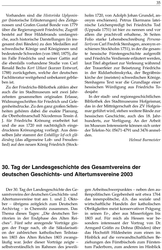 In der stadtund regionsgeschichtlichen Bibliothek des Stadtmuseums Hofgeismar, das in der Mitträgerschaft des ZV Hofgeismar geführt wird, stehen weitere Bände zur hessischen Geschichte, auch des 18. Jahrhunderts, zur Verfügung. An der Arbeit im Museum Interessierte können sich unter der TelefonNr. 056714791 und 3476 anmelden.