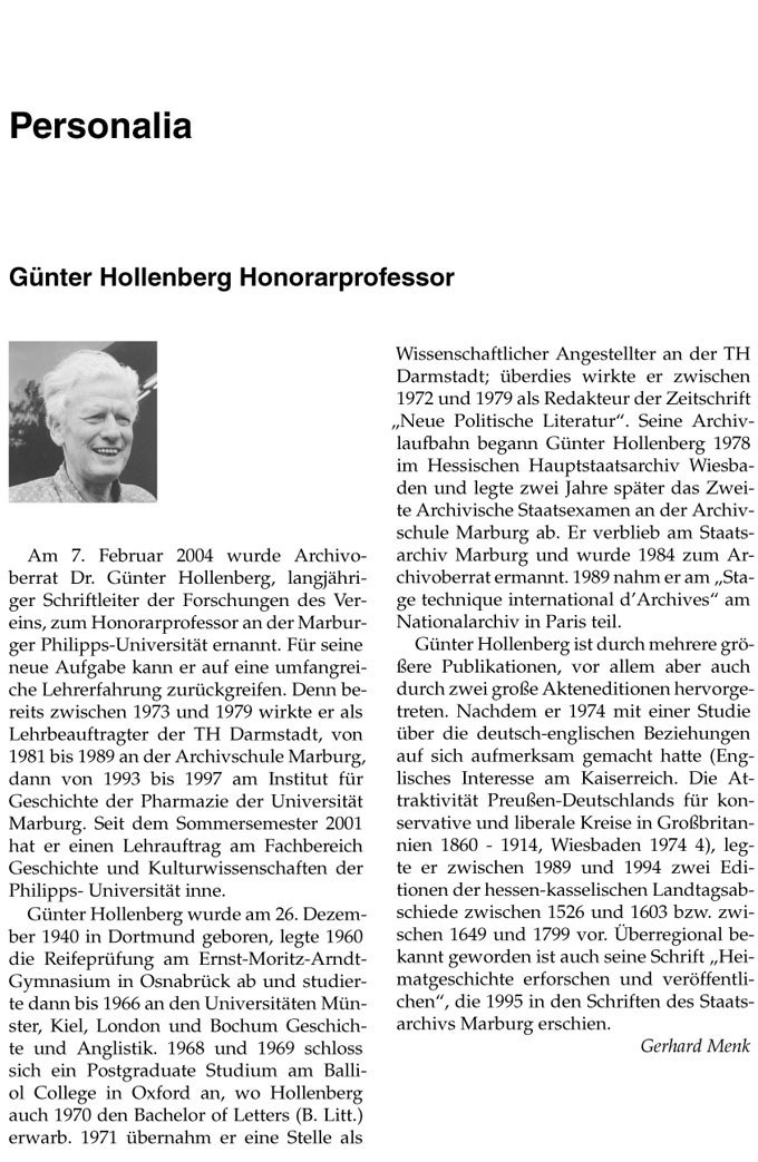 Am 7. Februar 2004 wurde Archivoberrat Dr. Günter Hollenberg, langjähriger Schriftleiter der Forschungen des Vereins, zum Honorarprofessor an der Marburger PhilippsUniversität ernannt. Für seine neue Aufgabe kann er auf eine umfangreiche Lehrerfahrung zurückgreifen. Denn bereits zwischen 1973 und 1979 wirkte er als Lehrbeauftragter der TH Darmstadt, von 1981 bis 1989 an der Archivschule Marburg, dann von 1993 bis 1997 am Institut für Geschichte der Pharmazie der Universität Marburg. Seit dem Sommersemester 2001 hat er einen Lehrauftrag am Fachbereich Geschichte und Kulturwissenschaften der PhilippsUniversität inne.