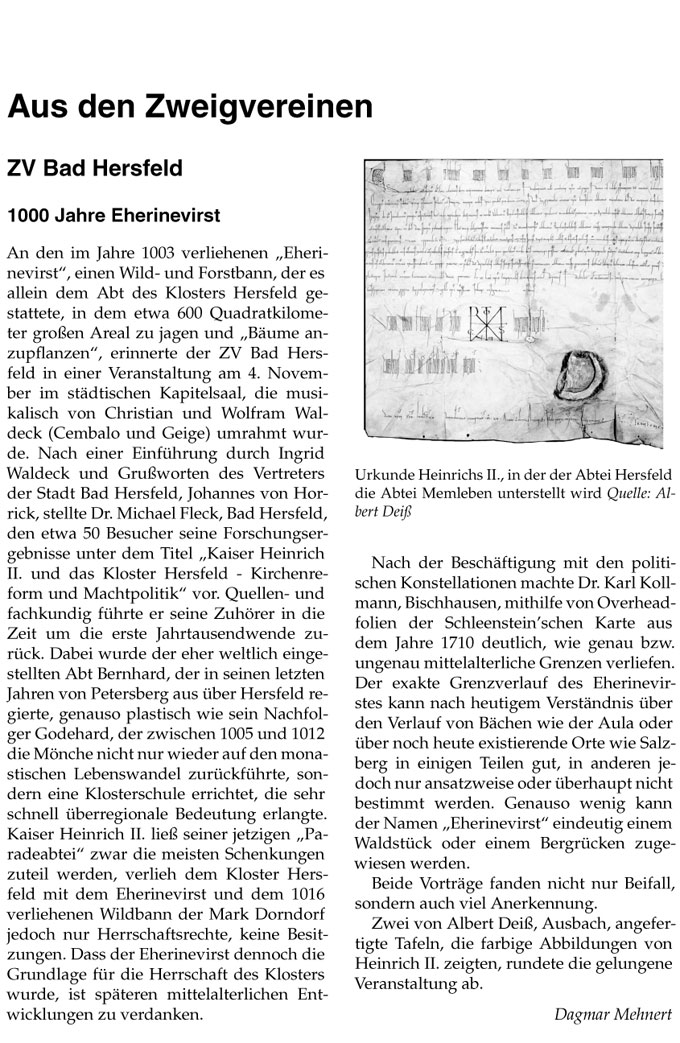 An den im Jahre 1003 verliehenen „Eherinevirst“, einen Wildund Forstbann, der es allein dem Abt des Klosters Hersfeld gestattete, in dem etwa 600 Quadratkilometer großen Areal zu jagen und „Bäume anzup?anzen“, erinnerte der ZV Bad Hersfeld in einer Veranstaltung am 4. November im städtischen Kapitelsaal, die musikalisch von Christian und Wolfram Waldeck (Cembalo und Geige) umrahmt wurde. Nach einer Einführung durch Ingrid Waldeck und Grußworten des Vertreters der Stadt Bad Hersfeld, Johannes von Horrick, stellte Dr. Michael Fleck, Bad Hersfeld, den etwa 50 Besucher seine Forschungsergebnisse unter dem Titel „Kaiser Heinrich