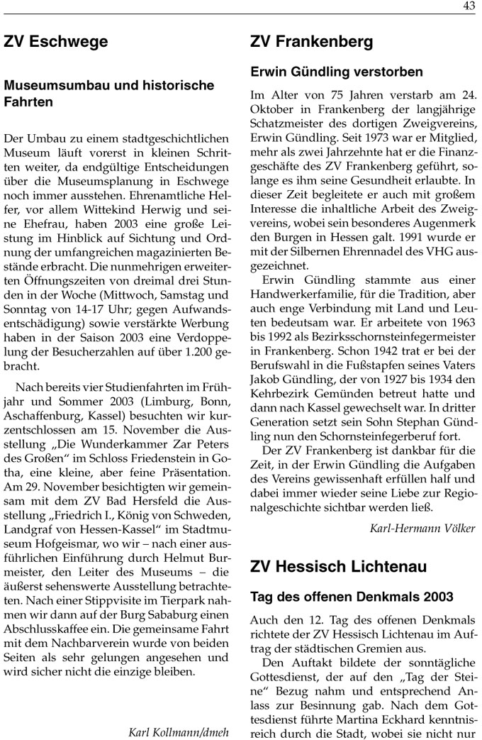 Im Alter von 75 Jahren verstarb am 24. Oktober in Frankenberg der langjährige Schatzmeister des dortigen Zweigvereins, Erwin Gündling. Seit 1973 war er Mitglied, mehr als zwei Jahrzehnte hat er die Finanzgeschäfte des ZV Frankenberg geführt, solange es ihm seine Gesundheit erlaubte. In dieser Zeit begleitete er auch mit großem Interesse die inhaltliche Arbeit des Zweigvereins, wobei sein besonderes Augenmerk den Burgen in Hessen galt. 1991 wurde er mit der Silbernen Ehrennadel des VHG ausgezeichnet.