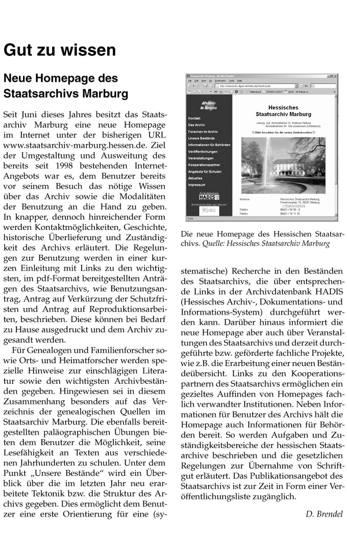 Seit Juni dieses Jahres besitzt das Staatsarchiv Marburg eine neue Homepage im Internet unter der bisherigen URL www.staatsarchivmarburg.hessen.de. Ziel der Umgestaltung und Ausweitung des bereits seit 1998 bestehenden InternetAngebots war es, dem Benutzer bereits vor seinem Besuch das nötige Wissen über das Archiv sowie die Modalitäten der Benutzung an die Hand zu geben. In knapper, dennoch hinreichender Form werden Kontaktmöglichkeiten, Geschichte, historische Überlieferung und Zuständigkeit des Archivs erläutert. Die Regelungen zur Benutzung werden in einer kurzen Einleitung mit Links zu den wichtigsten, im pdfFormat bereitgestellten Anträgen des Staatsarchivs, wie Benutzungsantrag, Antrag auf Verkürzung der Schutzfristen und Antrag auf Reproduktionsarbeiten, beschrieben. Diese können bei Bedarf zu Hause ausgedruckt und dem Archiv zugesandt werden.