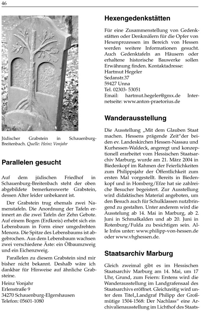 Für eine Zusammenstellung von Gedenkstätten oder Denkmälern für die Opfer von Hexenprozessen im Bereich von Hessen werden weitere Informationen gesucht. Auch Gedenktafeln an Häusern oder erhaltene historische Bauwerke sollen Erwähnung ?nden. Kontaktadresse: Hartmut Hegeler Sedanstr.37 59427 Unna Tel. 0230353051 Email: hartmut.hegeler@gmx.de Internetseite: www.antonpraetorius.de