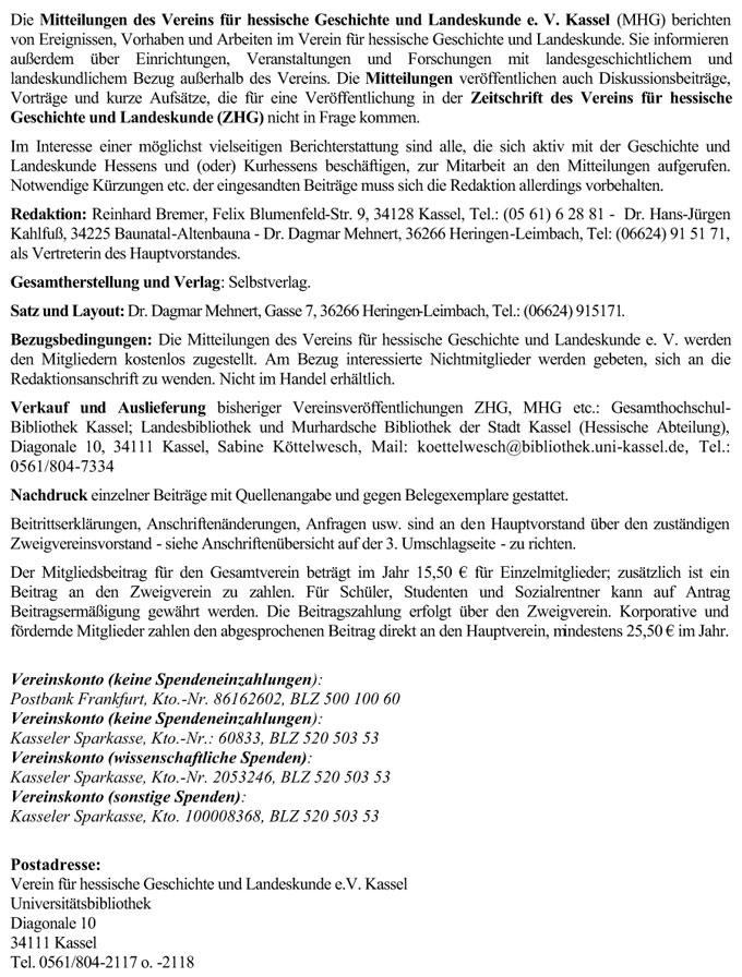 Bezugsbedingungen: Die Mitteilungen des Vereins für hessische Geschichte und Landeskunde e. V. werden den Mitgliedern kostenlos zugestellt. Am Bezug interessierte Nichtmitglieder werden gebeten, sich an die Redaktionsanschrift zu wenden. Nicht im Handel erhältlich.