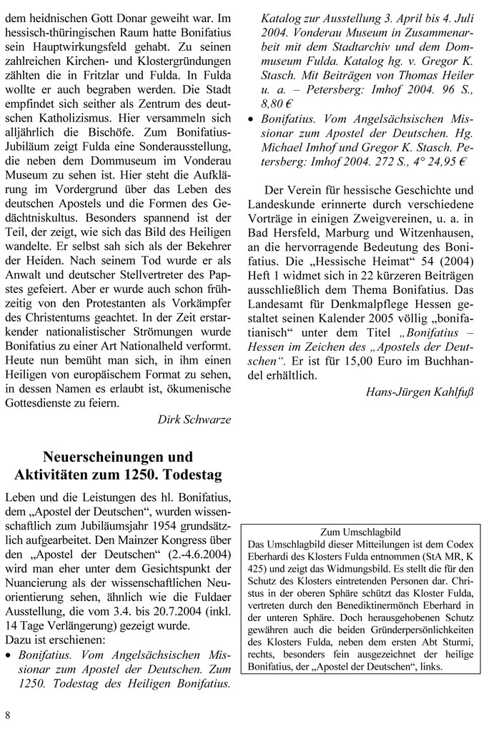Leben und die Leistungen des hl. Bonifatius, dem „Apostel der Deutschen“, wurden wissenschaftlich zum Jubiläumsjahr 1954 grundsätzlich aufgearbeitet. Den Mainzer Kongress über den „Apostel der Deutschen“ (2.-4.6.2004) wird man eher unter dem Gesichtspunkt der Nuancierung als der wissenschaftlichen Neuorientierung sehen, ähnlich wie die Fuldaer Ausstellung, die vom 3.4. bis 20.7.2004 (inkl. 14 Tage Verlängerung) gezeigt wurde. Dazu ist erschienen: