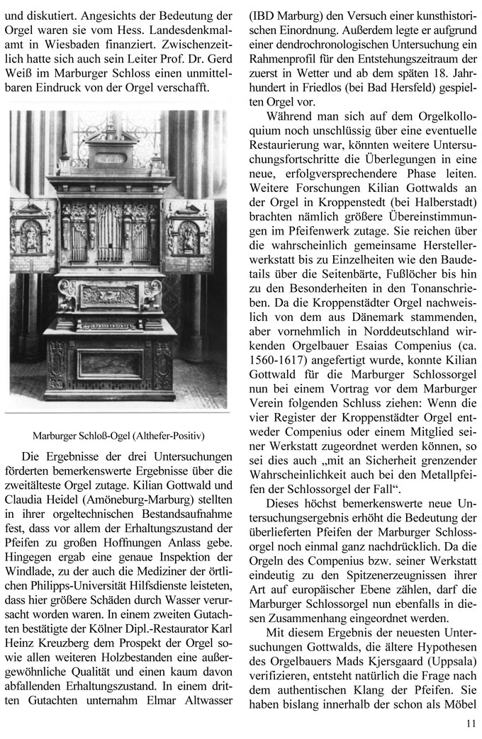 Dieses höchst bemerkenswerte neue Untersuchungsergebnis erhöht die Bedeutung der überlieferten Pfeifen der Marburger Schlossorgel noch einmal ganz nachdrücklich. Da die Orgeln des Compenius bzw. seiner Werkstatt eindeutig zu den Spitzenerzeugnissen ihrer Art auf europäischer Ebene zählen, darf die Marburger Schlossorgel nun ebenfalls in die-sen Zusammenhang eingeordnet werden.