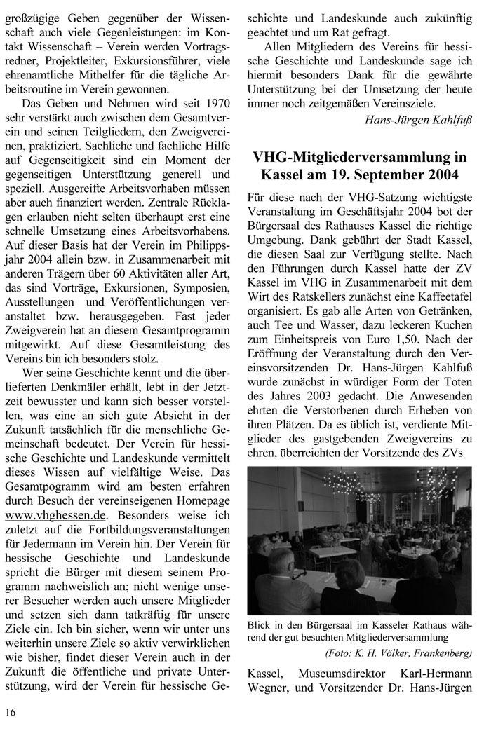 Für diese nach der VHG-Satzung wichtigste Veranstaltung im Geschäftsjahr 2004 bot der Bürgersaal des Rathauses Kassel die richtige Umgebung. Dank gebührt der Stadt Kassel, die diesen Saal zur Verfügung stellte. Nach den Führungen durch Kassel hatte der ZV Kassel im VHG in Zusammenarbeit mit dem Wirt des Ratskellers zunächst eine Kaffeetafel organisiert. Es gab alle Arten von Getränken, auch Tee und Wasser, dazu leckeren Kuchen zum Einheitspreis von Euro 1,50. Nach der Eröffnung der Veranstaltung durch den Vereinsvorsitzenden Dr. Hans-Jürgen Kahlfuß wurde zunächst in würdiger Form der Toten des Jahres 2003 gedacht. Die Anwesenden ehrten die Verstorbenen durch Erheben von ihren Plätzen. Da es üblich ist, verdiente Mitglieder des gastgebenden Zweigvereins zu ehren, überreichten der Vorsitzende des ZVs