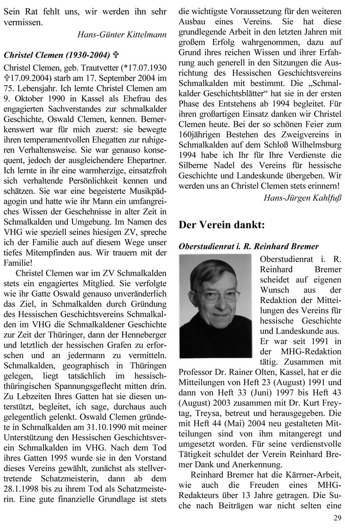 Professor Dr. Rainer Olten, Kassel, hat er die Mitteilungen von Heft 23 (August) 1991 und dann von Heft 33 (Juni) 1997 bis Heft 43 (August) 2003 zusammen mit Dr. Kurt Frey-tag, Treysa, betreut und herausgegeben. Die mit Heft 44 (Mai) 2004 neu gestalteten Mitteilungen sind von ihm mitangeregt und umgesetzt worden. Für seine verdienstvolle Tätigkeit schuldet der Verein Reinhard Bremer Dank und Anerkennung.