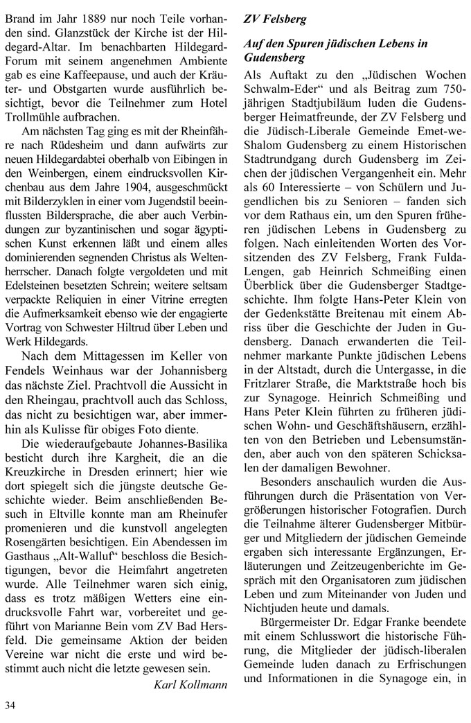 Als Auftakt zu den „Jüdischen Wochen Schwalm-Eder“ und als Beitrag zum 750jährigen Stadtjubiläum luden die Gudensberger Heimatfreunde, der ZV Felsberg und die Jüdisch-Liberale Gemeinde Emet-we-Shalom Gudensberg zu einem Historischen Stadtrundgang durch Gudensberg im Zeichen der jüdischen Vergangenheit ein. Mehr als 60 Interessierte – von Schülern und Jugendlichen bis zu Senioren – fanden sich vor dem Rathaus ein, um den Spuren früheren jüdischen Lebens in Gudensberg zu folgen. Nach einleitenden Worten des Vorsitzenden des ZV Felsberg, Frank Fulda-Lengen, gab Heinrich Schmeißing einen Überblick über die Gudensberger Stadtgeschichte. Ihm folgte Hans-Peter Klein von der Gedenkstätte Breitenau mit einem Abriss über die Geschichte der Juden in Gudensberg. Danach erwanderten die Teilnehmer markante Punkte jüdischen Lebens in der Altstadt, durch die Untergasse, in die Fritzlarer Straße, die Marktstraße hoch bis zur Synagoge. Heinrich Schmeißing und Hans Peter Klein führten zu früheren jüdischen Wohn- und Geschäftshäusern, erzählten von den Betrieben und Lebensumständen, aber auch von den späteren Schicksalen der damaligen Bewohner.