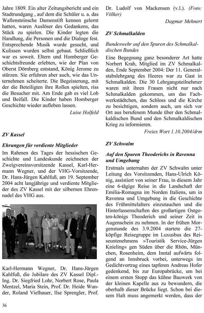 Im Rahmen des Tages der hessischen Geschichte und Landeskunde zeichneten der Zweigvereinsvorsitzende Kassel, Karl-Her-mann Wegner, und der VHG-Vorsitzende, Dr. Hans-Jürgen Kahlfuß, am 19. September 2004 acht langjährige und verdiente Mitglieder des ZV Kassel mit der silbernen Ehrennadel des VHG aus.