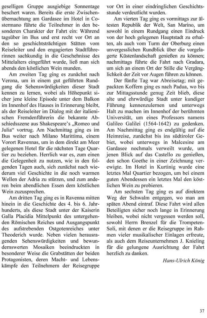 Der fünfte Tag war Abreisetag; mit gepackten Koffern ging es nach Padua, wo bis zur Mittagsstunde genug Zeit blieb, diese alte und ehrwürdige Stadt unter kundiger Führung kennenzulernen und unterwegs Halt zu machen im Innenhof der berühmten Universität, um eines Professors namens Galileo Galilei (1564-1642) zu gedenken. Am Nachmittag ging es endgültig auf die Heimreise, zunächst bis ins südtiroler Gebiet, wobei unterwegs in Malcesine am Gardasee nochmals verweilt wurde, um jenen Blick auf das Castello zu genießen, den schon Goethe in einer Zeichnung verewigte. Im Hotel in Kurtinig wurde eine letztes Mal Quartier bezogen, um bei einem guten Abendessen ein letztes Mal den köstlichen Wein zu probieren.