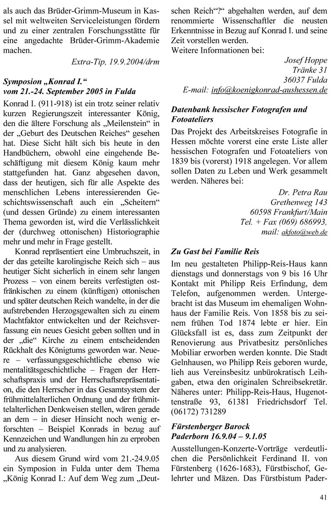 Aus diesem Grund wird vom 21.-24.9.05 ein Symposion in Fulda unter dem Thema „König Konrad I.: Auf dem Weg zum „Deutschen Reich“?“ abgehalten werden, auf dem renommierte Wissenschaftler die neusten Erkenntnisse in Bezug auf Konrad I. und seine Zeit vorstellen werden. Weitere Informationen bei: