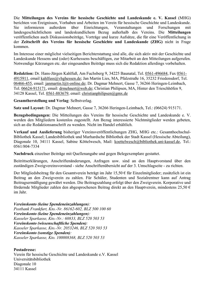 Bezugsbedingungen: Die Mitteilungen des Vereins für hessische Geschichte und Landeskunde e. V. werden den Mitgliedern kostenlos zugestellt. Am Bezug interessierte Nichtmitglieder werden gebeten, sich an die Redaktionsanschrift zu wenden. Nicht im Handel erhältlich.