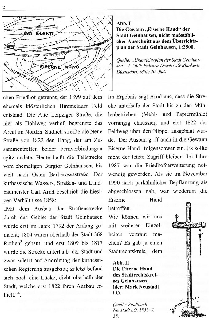 Im Ergebnis sagt Arnd aus, dass die Strecke unterhalb der Stadt bis zu den Mühlenbetrieben (Mehl- und Papiermühle) vorrangig chaussiert und erst 1822 der Feldweg über den' Nippel ausgebaut wurde. Der Ausbau griff auch in die Gewann Eiserne Hand folgenschwer ein. Es sollte nicht der letzte Zugriff bleiben. Im Jahre 1987 war die Friedhofserweiterung notwendig geworden. Als sie im November 1990 nach parkähnlicher Bepflanzung als abgeschlossen galt, war wiederum die Eiserne Hand