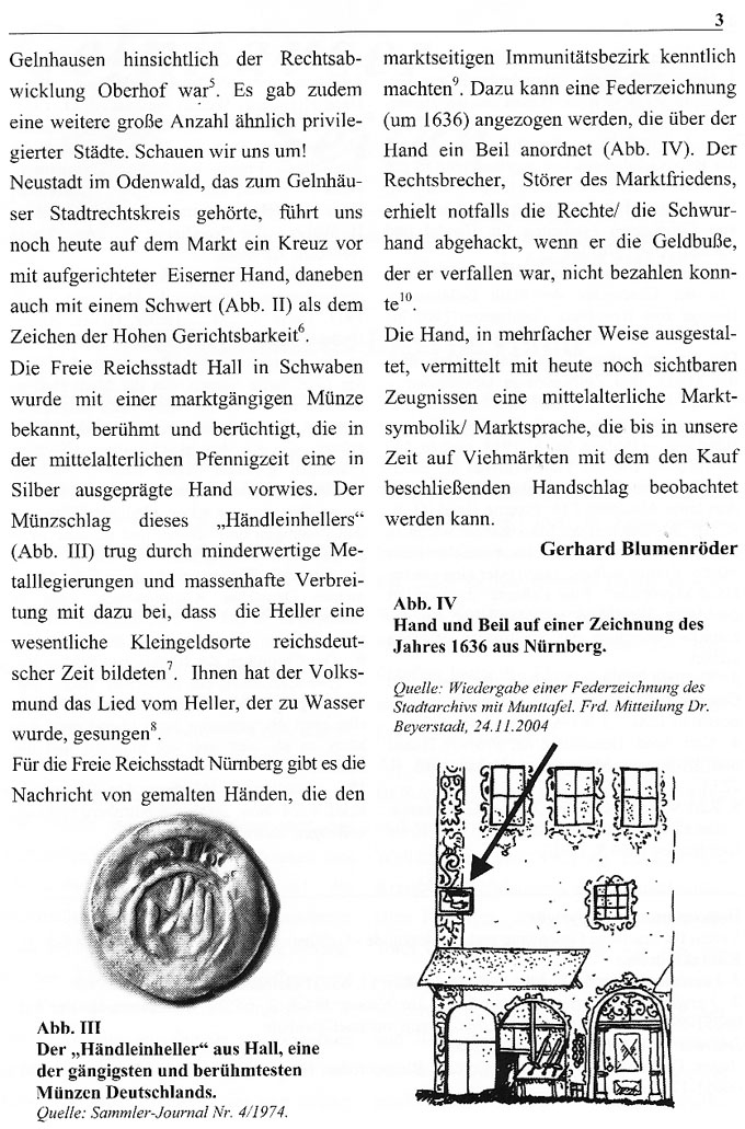 marktseitigen Immunitätsbezirk kenntlich machteng. Dazu kann eine Federzeichnung (um 1636) angezogen werden, die über der Hand ein Beil anordnet (Abb. IV). Der Rechtsbrecher, Störer des Marktfriedens, erhielt notfalls die Rechte/ die Schwurhand abgehackt, wenn er die Geldbuße, der er verfallen war, nicht bezahlen konnte.