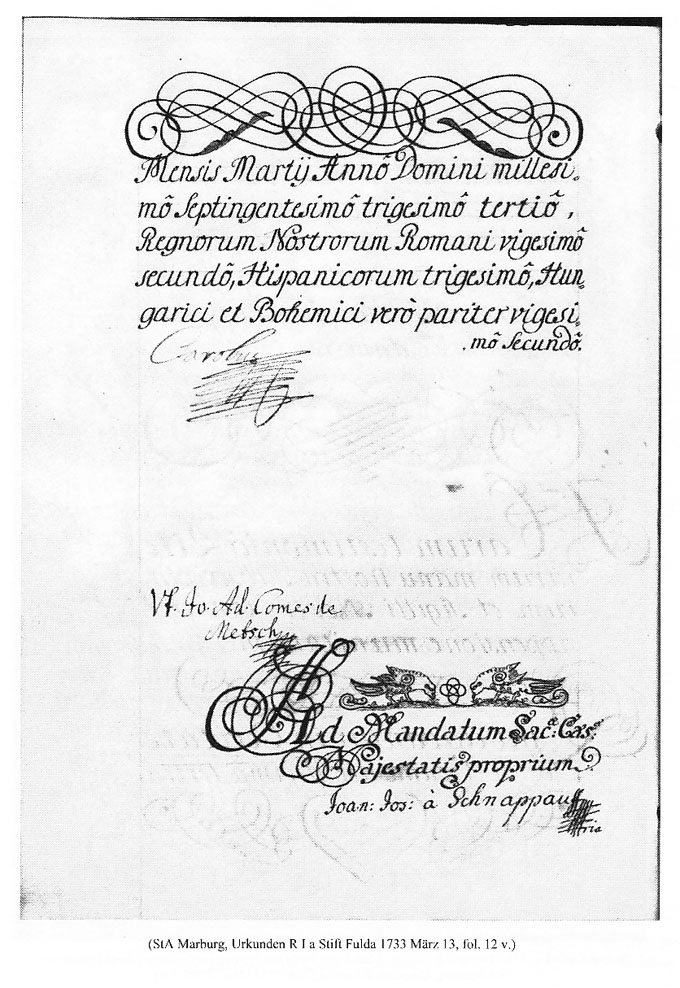 (StA Marburg, Urkunden R 1 a Stift Fulda 1733 März 13, fol. 12 v.)