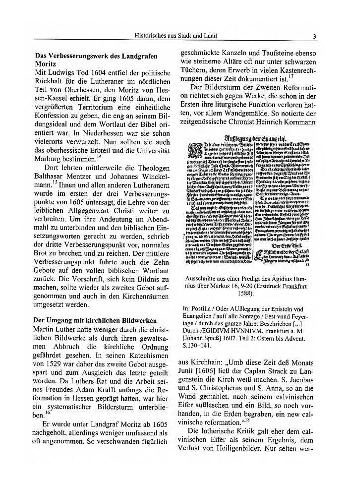 Martin Luther hatte weniger durch die christ-lichen Bildwerke als durch ihren gewaltsamen Abbruch die kirchliche Ordnung gefährdet gesehen. In seinen Katechismen von 1529 war daher das zweite Gebot ausgespart und zum Ausgleich das letzte geteilt worden. Da Luthers Rat und die Arbeit seines Freundes Adam Krafft anfangs die Reformation in Hessen geprägt hatten, war hier ein systema-tischer Bildersturm unterblieben.16