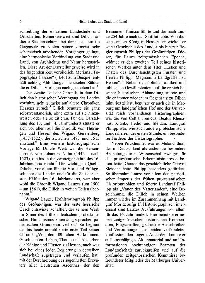 Neben Pirckheimer war es Melanchthon, der in Deutschland als erster die besondere Be-deutung dieses Wissenschaftszweiges für das protestantische Erkenntnisinteresse betont hatte. Gerade das geschichtliche Oeuvre Sleidans hatte Philipp besonders gefördert. So übernahm Lauze vor allem den patriotischen Impetus der frühen protestantischen Histo-riographien und feierte Landgraf Philipp als "Vatter des Vatterlandes", eine Bezeichnung, die Dilich in seinen Werken immer wieder im Zusammenhang mit Landgraf Moritz aufgriff. Historiographisch interessant sind Lauzes Ausführungen vor allem für das 16. Jahrhundert. Hier benutzte er neben zeit-genössischen historischen Kompendien Flug-schriften, gedruckte Ausschreiben und Ver-ordnungen aus beiden verfeindeten konfes-sionellen Lagern. Außerdem konnte er auf einschlägiges Aktenmaterial und auf Infor-mationen hochrangiger Beamte der Landgrafschaft zurückgreifen und auf die profunden zeitgenössischen Kenntnisse befreundeter Mitglieder der Marburger Universität.