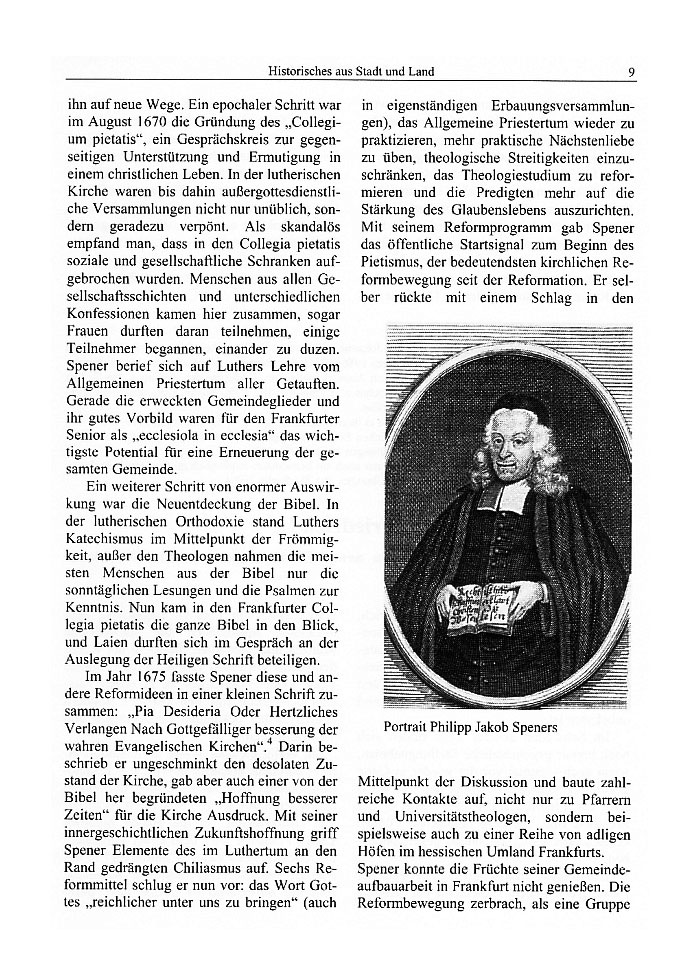 Ein weiterer Schritt von enormer Auswirkung war die Neuentdeckung der Bibel. In der lutherischen Orthodoxie stand Luthers Kate-chismus im Mittelpunkt der Frömmigkeit, außer den Theologen nahmen die meisten Menschen aus der Bibel nur die sonntägli-chen Lesungen und die Psalmen zur Kenn-tnis. Nun kam in den Frankfurter Collegia pietatis die ganze Bibel in den Blick, und Laien durften sich im Gespräch an der Ausle-gung der Heiligen Schrift beteiligen.