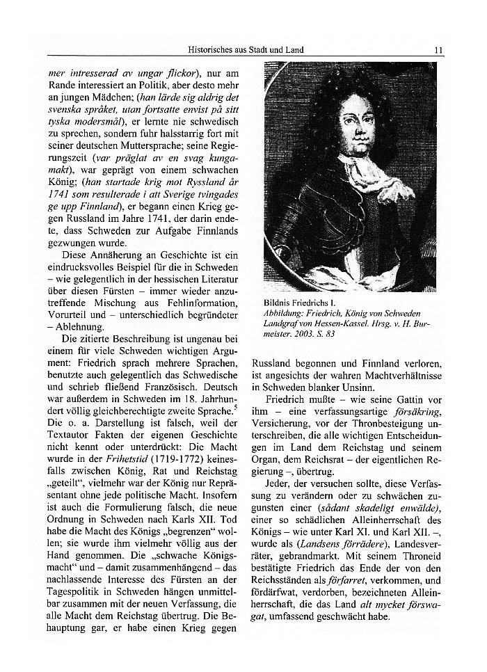 Die zitierte Beschreibung ist ungenau bei einem für viele Schweden wichtigen Argu-ment: Friedrich sprach mehrere Sprachen, benutzte auch gelegentlich das Schwedische und schrieb fließend Französisch. Deutsch war außerdem in Schweden im 18. Jahrhun-dert völlig gleichberechtigte zweite Sprache5. Die o. a. Darstellung ist falsch, weil der Text-autor Fakten der eigenen Geschichte nicht kennt oder unterdrückt: Die Macht wurde in der Frihetstid (1719-1772) keinesfalls zwi-schen König, Rat und Reichstag "geteilt", vielmehr war der König nur Repräsentant ohne jede politische Macht. Insofern ist auch die Formulierung falsch, die neue Ordnung in Schweden nach Karls XII. Tod habe die Macht des Königs "begrenzen" wollen; sie wurde ihm vielmehr völlig aus der Hand genommen. Die "schwache Königsmacht" und-damit zusammenhängend-das nach-lassende Interesse des Fürsten an der Tages-politik in Schweden hängen unmittelbar zu-sammen mit der neuen Verfassung, die alle Macht dem Reichstag übertrug. Die Behaup-tung gar, er habe einen Krieg gegen Russland begonnen (und Finnland verloren), ist ange-sichts der wahren Machtverhältnisse in Schweden blanker Unsinn.