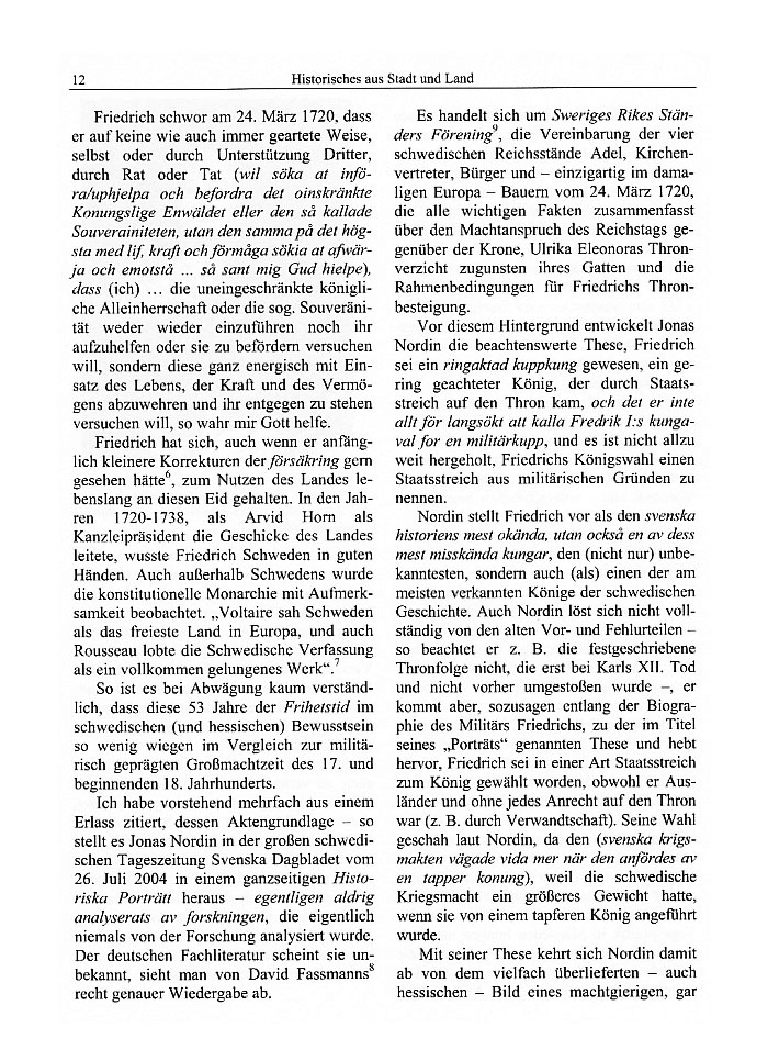 Es handelt sich um Sweriges Rikes Ständers Förening9, die Vereinbarung der (vier) schwedischen Reichsstände (Adel, Kirchen-vertreter, Bürger und - einzigartig im damali-gen Europa - Bauern) vom 24. März 1720, die alle wichtigen Fakten zusammenfasst über den Machtanspruch des Reichstags gegenüber der Krone, Ulrika Eleonoras Thronverzicht zugunsten ihres Gatten und die Rahmenbedingungen für Friedrichs Thronbe-steigung.