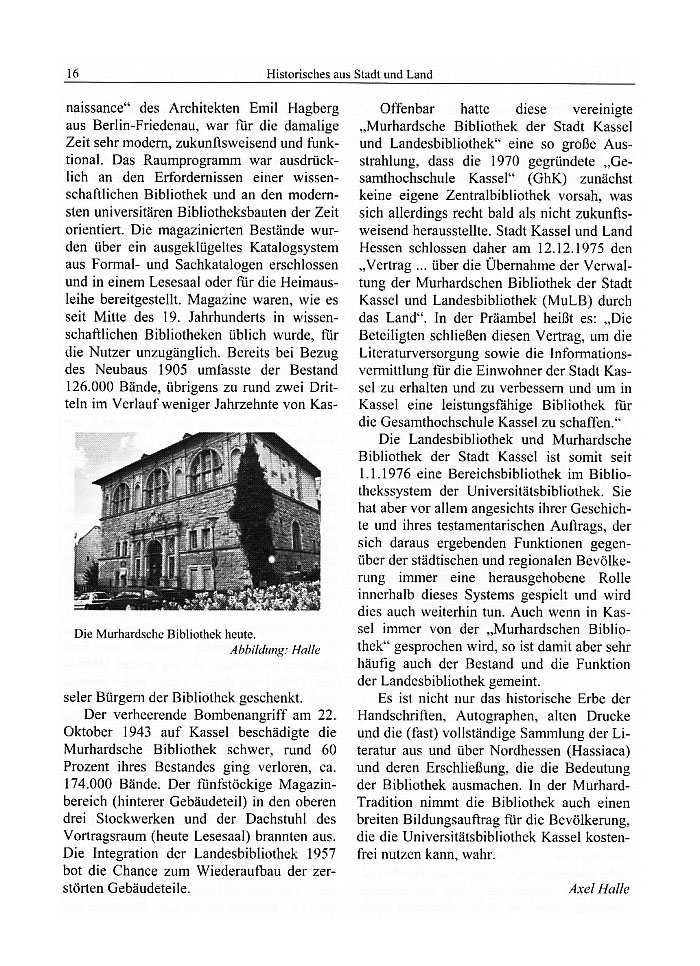 Renaissance" des Architekten Emil Hagberg aus Berlin-Friedenau war für die damalige Zeit sehr modern, zukunftsweisend und funktional. Das Raumprogramm war ausdrücklich an den Erfordernissen einer wissenschaftlichen Bibliothek und an den modernsten universitären Bibliotheksbauten der Zeit orientiert. Die magazinierten Be-stände wurden über ein ausgeklügeltes Katalogsystem aus Formal- und Sachkatalogen erschlossen und in einem Lesesaal oder für die Heimausleihe bereitgestellt. Magazine waren, wie es seit Mitte des 19. Jahrhunderts in wissenschaftlichen Bibliotheken üblich wurde, für die Nutzer unzu-gänglich. Bereits bei Bezug des Neubaus 1905 umfasste der Bestand 126.000 Bände, übrigens zu rund zwei Dritteln im Verlauf weniger Jahrzehnte von Kasseler Bürgern der Bibliothek geschenkt.
