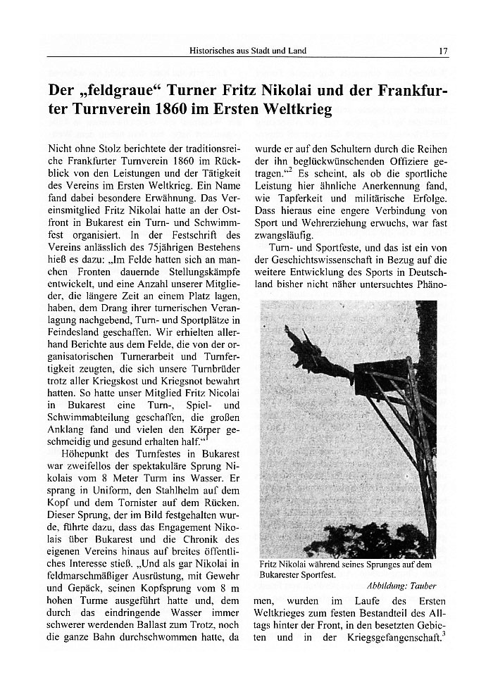 Nicht ohne Stolz berichtete der traditionsrei-che Frankfurter Turnverein 1860 im Rück-blick von den Leistungen und der Tätigkeit des Vereins im Ersten Weltkrieg. Ein Name fand dabei besondere Erwähnung. Das Ver-einsmitglied Fritz Nikolai hatte an der Ost-front in Bukarest ein Turn- und Schwimmfest organisiert. In der Festschrift des Vereins anlässlich des 75jährigen Bestehens hieß es dazu: "Im Felde hatten sich an manchen Fronten dauernde Stellungskämpfe entwi-ckelt, und eine Anzahl unserer Mitglieder, die längere Zeit an einem Platz lagen, haben, dem Drang ihrer turnerischen Veranlagung nachgebend, Turn- und Sportplätze in Fein-desland geschaffen. Wir erhielten allerhand Berichte aus dem Felde, die von der organisa-torischen Turnerarbeit und Turnfertigkeit zeugten, die sich unsere Turnbrüder trotz aller Kriegskost und Kriegsnot bewahrt hatten. So hatte unser Mitglieder Fritz Nicolai in Bukarest eine Turn-, Spiel- und Schwimmab-teilung geschaffen, die großen Anklang fand und vielen den Körper geschmeidig und ge-sund erhalten half."1