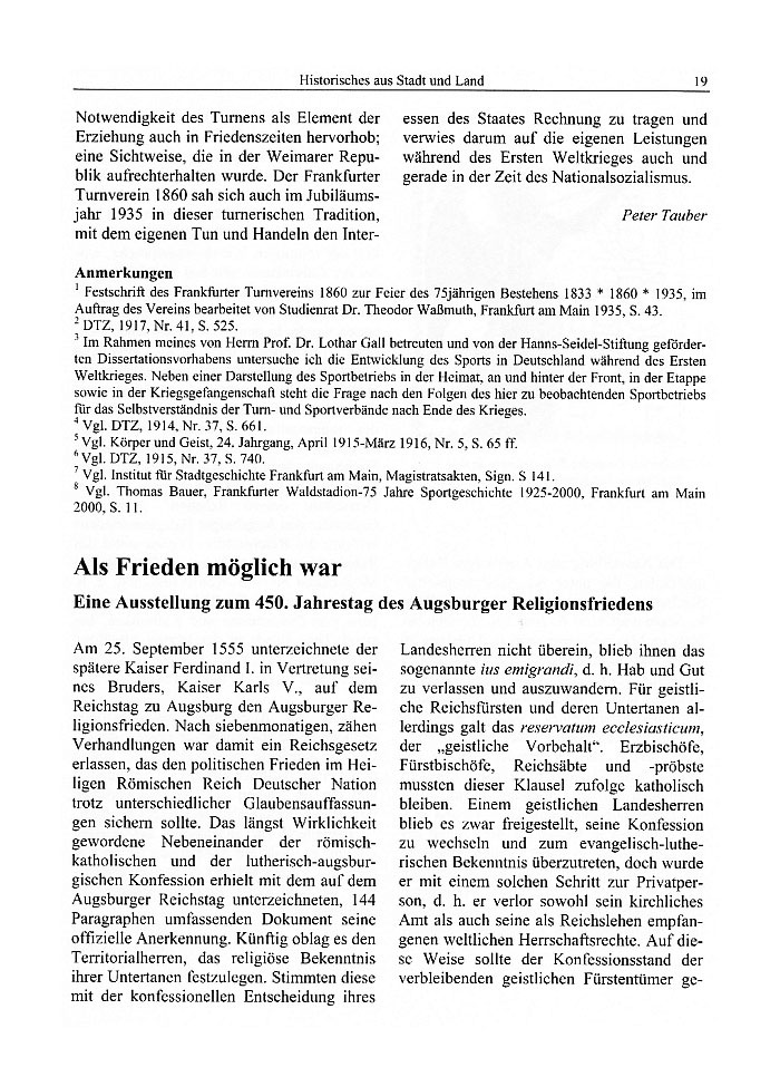 Notwendigkeit des Turnens als Element der Erziehung auch in Friedenszeiten hervorhob; eine Sichtweise, die in der Weimarer Republik aufrechterhalten wurde. Der Frankfurter Turnverein 1860 sah sich auch im Jubiläums-jahr 1935 in dieser turnerischen Tradition, mit dem eigenen Tun und Handeln den Inter-essen des Staates Rechnung zu tragen und verwies darum auf die eigenen Leistungen während des Ersten Weltkrieges-auch und gerade in der Zeit des Nationalsozialismus.