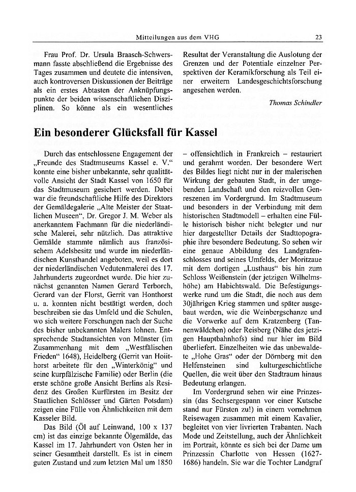 Durch das entschlossene Engagement der "Freunde des Stadtmuseums Kassel e. V." konnte eine bisher unbekannte, sehr qualitätvolle Ansicht der Stadt Kassel von 1650 für das Stadtmuseum gesichert werden. Dabei war die freundschaftliche Hilfe des Direktors der Gemäldegalerie "Alte Meister der Staatlichen Museen, Dr. Gregor J. M. Weber als anerkanntem Fachmann für die niederländische Malerei, sehr nützlich. Das attraktive Gemälde stammte nämlich aus französischem Adelsbesitz und wurde im niederländischen Kunsthandel angeboten, weil es dort der niederländischen Vedutenmalerei des 17. Jahrhunderts zugeordnet wurde. Die hier zunächst genannten Namen Gerard Terborch, Gerard van der Florst, Gerrit van Honthorst u. a. konnten nicht bestätigt werden, doch beschreiben sie das Umfeld und die Schulen, wo sich weitere Forschungen nach der Suche des bisher unbekannten Malers lohnen. Entsprechende Stadtansichten von Münster (im Zusammenhang mit dem "Westfälischen Frieden" 1648), Heidelberg (Gerrit van Hoiithorst arbeitete für den "Winterkönig" Lind seine kurpfälzische Familie) oder Berlin (die erste schöne große Ansicht Berlins als Residenz des Großen Kurfürsten im Besitz der Staatlichen Schlösser und Gärten Potsdani!) zeigen eine Fülle von Ähnlichkeiten mit dem Kasseler Bild.