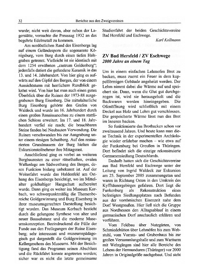 Deshalb hatten sich die Geschichtsvereine aus Bad Hersfeld und Eschwege unter der Leitung von Ingrid Waldeck zur Exkursion am 25. September 2005 zusammengetan und waren in Richtung Osten in den Umkreis des Kyffhäusergebirges gefahren. Dort liegt die Funkenburg als Rekonstruktion eines befestigten Siedlungsplatzes nach Befunden aus der vorrömischen Eisenzeit nahe dem Dorf Westgreußen. Hier ließ sich die Gruppe aus Nordhessen den Alltagsablauf in einem germanischen Dorf anschaulich erklären und vorführen.