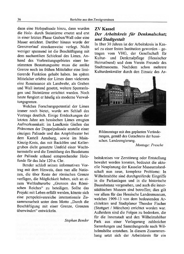 Bender schloß seinen informativen Vortrag mit dem Hinweis, dass nun alle Nationen, die über Reste der römischen Grenze verfügen, die Möglichkeit haben, sich an einem Weltkulturerbe „Grenzen des Römischen Reiches“ zu beteiligen. Sollte das Projekt mit Leben erfüllt werden, könnte sich eine perspektivenreiche internationale Zusammenarbeit unter dem Motto „Durch die Beschäftigung mit einer Grenze, Grenzen überwinden“ entwickeln.
