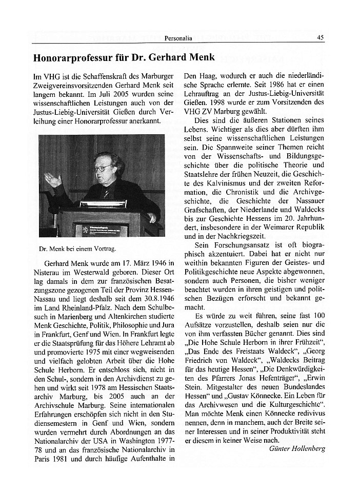 Im VHG ist die Schaffenskraft des Marburger Zweigvereinsvorsitzenden Gerhard Menk seit langem bekannt. Im Juli 2005 wurden seine wissenschaftlichen Leistungen auch von der Justus-Liebig-Universität Gießen durch Verleihung einer Honorarprofessur anerkannt.