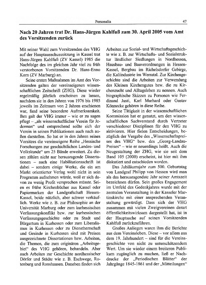 Seine ersten Maßnahmen im Amt des Vorsitzenden galten der vereinseigenen wissenschaftlichen Zeitschrift (ZHG). Diese wieder regelmäßig jährlich erscheinen zu lassen, nachdem sie in den Jahren von 1976 bis 1985 jeweils im Zeitraum von 2 Jahren erschienen war, fand seine besondere Aufmerksamkeit. Ihm galt der VHG immer - wie er zu sagen pflegt - „als wissenschaftlicher Verein für Jederman" und entsprechend sollte sich der Verein in seinen Publikationen auch nach außen darstellen. So hat er in den Jahren seines Vorsitzes die vereinseigene Reihe „Hessische Forschungen zur geschichtlichen Landes- und Volkskunde" um 25 Bände erweitert. Zu diesen zählen nicht nur herausragende Dissertationen - auch eine Habilitationsschrift ist dabei - sondern einige Werke, die ein am Markt orientierter Verlag wohl nicht in sein Programm aufnehmen würde, weil er sich davon zu wenig Profit versprechen müsste. Seien es frühe Kirchenbücher aus Kassel oder Papiermarken der Landgrafschaft HessenKassel, beide nützlich, aber schwer verkäuflich. Werke wie z. B. zur Philosophie an der Universität Marburg oder zum kurhessischen Verfassungskonflikt bzw. zur kurhessischen Verfassungsgeschichte oder zu Stadt und Bürgertum in Kurhessen oder zum Liberalismus in Kurhessen oder zu Dienstherrschaft und Gesinde in Kurhessen sind mit Preisen ausgezeichnete Dissertationen bzw. Arbeiten, die Themen, die zum originären „Arbeitsgebiet" des VHG gehören, behandeln. Aber auch Arbeiten zur Geschichte nordhessischer Dörfer und Städte wie z. B. Eschwege, Rotenburg und Ronshausen. Daneben finden sich