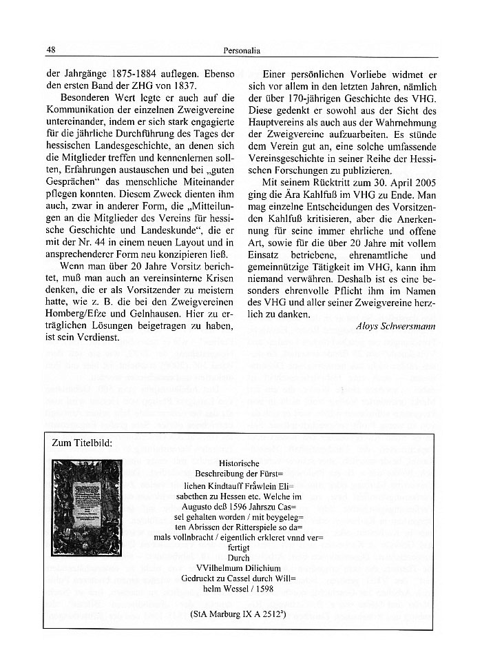 der Jahrgänge 1875-1884 auflegen. Ebenso den ersten Band der ZHG von 1837. Besonderen Wert legte er auch auf die Kommunikation der einzelnen Zweigvereine untereinander, indem er sich stark engagierte für die jährliche Durchführung des Tages der hessischen Landesgeschichte, an denen sich die Mitglieder treffen und kennenlernen sollten, Erfahrungen austauschen und bei „guten Gesprächen" das menschliche Miteinander pflegen konnten. Diesem Zweck dienten ihm auch, zwar in anderer Form, die „Mitteilungen an die Mitglieder des Vereins für hessische Geschichte und Landeskunde", die er mit der Nr. 44 in einem neuen Layout und in ansprechenderer Form neu konzipieren ließ.