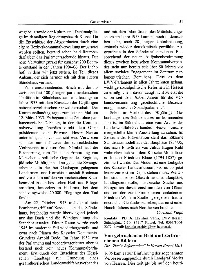 Priv.-Doz. Dr. Christina Vanja, Funktionsbereich “Archiv, Gedenkstätten, Historische Sammlungen“ des Landeswohlfahrtsverbandes Hessen, Ständeplatz 6-10, 34117 Kassel, Tel. 0561/1004-2277, e-mail: kontakt-archiv@lwv-hessen.de