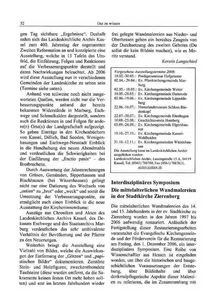 heutigen Tag sichtbare „Ergebnisse“. Deshalb nahm sich das Landeskirchliche Archiv Kassel zum 400. Jahrestag der sogenannten Zweiten Reformation an und konzipierte eine Ausstellung, welche in 13 Tafeln das Umfeld, die Einführung, Folgen und Reaktionen auf die Verbesserungspunkte darstellt und deren Nachwirkungen beleuchtet. Ab 2006 wird diese Ausstellung nun in verschiedenen Gemeinden der Landeskirche zu sehen sein (Termine siehe unten).
