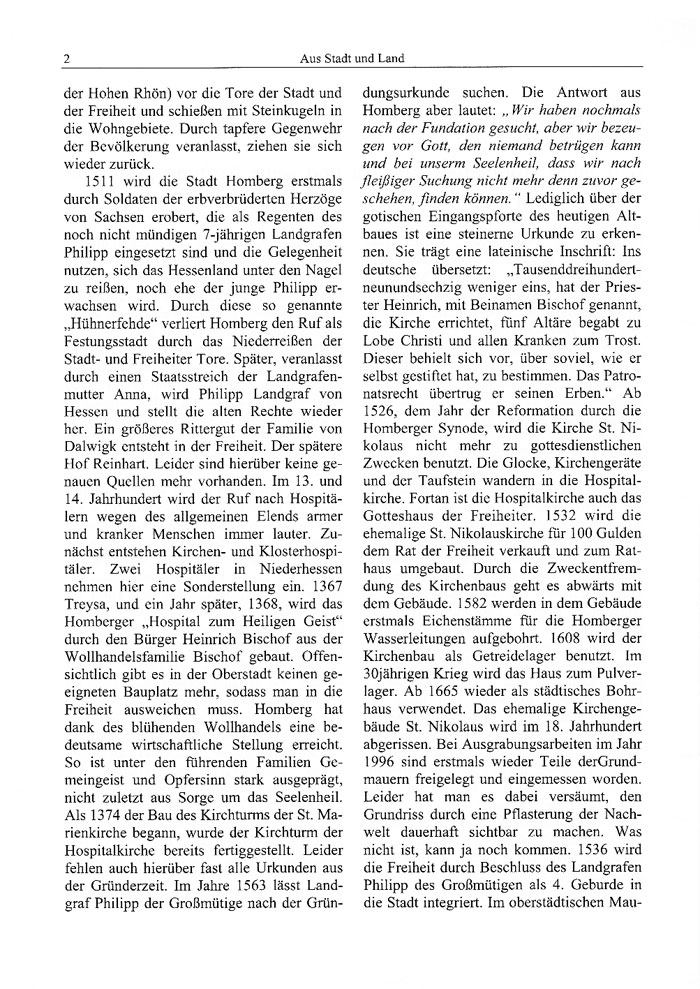 dungsurkunde suchen. Die Antwort aus Homberg aber lautet: „ Wir haben nochmals nach der Fundation gesucht, aber wir bezeugen vor Gott, den niemand betrügen kann und bei unserm Seelenheil, dass wir nach fleißiger Suchung nicht mehr denn zuvor geschehen, finden können. " Lediglich über der gotischen Eingangspforte des heutigen Altbaues ist eine steinerne Urkunde zu erkennen. Sie trägt eine lateinische Inschrift: Ins deutsche übersetzt: „Tausenddreihundertneunundsechzig weniger eins, hat der Priester Heinrich, mit Beinamen Bischof genannt, die Kirche errichtet, fünf Altäre begabt zu Lobe Christi und allen Kranken zum Trost. Dieser behielt sich vor, über soviel, wie er selbst gestiftet hat, zu bestimmen. Das Patronatsrecht übertrug er seinen Erben." Ab 1526, dem Jahr der Reformation durch die Homberger Synode, wird die Kirche St. Nikolaus nicht mehr zu gottesdienstlichen Zwecken benutzt. Die Glocke, Kirchengeräte und der Taufstein wandern in die Hospitalkirche. Fortan ist die Hospitalkirche auch das Gotteshaus der Freiheiter. 1532 wird die ehemalige St. Nikolauskirche für 100 Gulden dem Rat der Freiheit verkauft und zum Rathaus umgebaut. Durch die Zweckentfremdung des Kirchenbaus geht es abwärts mit dem Gebäude. 1582 werden in dem Gebäude erstmals Eichenstämme für die Homberger Wasserleitungen aufgebohrt. 1608 wird der Kirchenbau als Getreidelager benutzt. Im 30jährigen Krieg wird das Haus zum Pulverlager. Ab 1665 wieder als städtisches Bohrhaus verwendet. Das ehemalige Kirchengebäude St. Nikolaus wird im 18. Jahrhundert abgerissen. Bei Ausgrabungsarbeiten im Jahr 1996 sind erstmals wieder Teile derGrundmauern freigelegt und eingemessen worden. Leider hat man es dabei versäumt, den Grundriss durch eine Pflasterung der Nachwelt dauerhaft sichtbar zu machen. Was nicht ist, kann ja noch kommen. 1536 wird die Freiheit durch Beschluss des Landgrafen Philipp des Großmütigen als 4. Geburde in die Stadt integriert. Im oberstädtischen Mau-