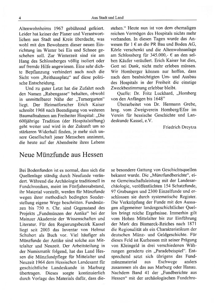 stehen." Heute nun ist von dem ehemaligen reichen Vermögen des Hospitals nichts mehr vorhanden. In diesen Tagen wurde das Anwesen für 1 € an die PR Bau und Boden AG, Körle verschenkt und die Altenwohnanlage am Schlossberg für 345.000,- € an den selben Käufer veräußert. Erich Kaiser hat dies, Gott sei Dank, nicht mehr erleben müssen. Wir Homberger können nur hoffen, dass nach dem beabsichtigten Um- und Ausbau des Hospitals in der Freiheit die einstige Zweckbestimmung erlebbar bleibt.