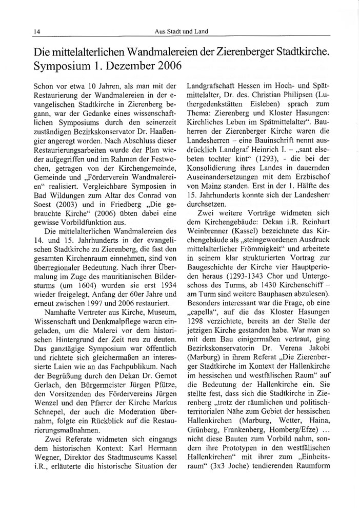 Die mittelalterlichen Wandmalereien der Zierenberger Stadtkirche. Symposium 1. Dezember 2006
