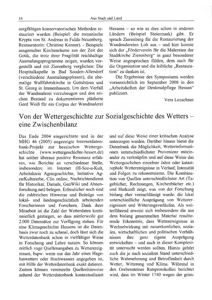 Das Ende 2004 eingerichtete und in der MHG 46 (2005) angezeigte Internetdatenbank-Projekt zur hessischen Wettergeschichte (www.wettergeschichte-hessen.de) hat seither überaus positive Resonanz erfahren, wie Berichte an verschiedener Stelle, insbesondere im Internet (H-Soz-u-Kult, Arbeitskreis Agrargeschichte, Initiative AgrarKulturerbe, Clio online, Nachrichtendienst für Historiker, Damals, GenWiki und Ahnenforschung.net) belegen. Erfreulicher noch sind die zahlreichen Hinweise und Beiträge von lokal- und landesgeschichtlich arbeitenden Forscherinnen und Forschern. Dank ihrer Mitarbeit ist die Zahl der Wetterdaten kontinuierlich gestiegen, so dass mittlerweile gut 2.000 Datensätze zur Verfügung stehen. Für eine Klimageschichte Hessens ist die Datenbasis zwar noch zu schmal, doch lässt sich die Wetterdatenbank schon in vielfältiger Weise in Forschung und Lehre nutzen. So können zeitlich vage Quellenangaben zu Wetterereignissen, bspw. wenn nur das Jahr eines Hagelunwetters oder Hochwassers angegeben ist, mit Hilfe der Wetterdatenbank exakt datieren. Zudem können vereinzelte Quellenhinweise anhand der Wetterdatenbank kontextualisiert