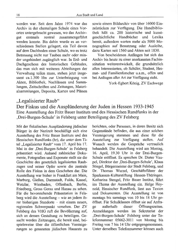 Mit der fiskalischen Ausplünderung jüdischer Bürger in der Nazizeit beschäftigt sich eine Ausstellung des Fritz Bauer Instituts und des Hessischen Rundfunks (hr), die unter dem Titel „Legalisierter Raub" vom 17. April bis 17. Mai in der ,Drei-Burgen-Schule' in Felsberg präsentiert wird. Anhand zahlreicher Dokumente, Fotografien und Exponate stellt sie die Geschichte des gesetzlich legalisierten Raubzuges und seiner Opfer sowie die zentrale Rolle des Fiskus in dem Geschehen dar. Die Ausstellung war bisher in Frankfurt am Main, Marburg, Gießen, Darmstadt, Fulda, Kassel, Wetzlar, Wiesbaden, Offenbach, Berlin, Friedberg, Gross Gerau und Hanau zu sehen. Für die bevorstehende Präsentation in Felsberg wird die Ausstellung - wie an jedem ihrer bisherigen Standorte - mit einem neuen, regionalen Schwerpunkt versehen. Der ZV Felsberg des VHG ruft die Bevölkerung auf, sich an dessen Gestaltung zu beteiligen. Gesucht werden Zeitzeugen, die bereit sind, beispielsweise über die öffentlichen Versteigerungen so genannten jüdischen Hausrats zu