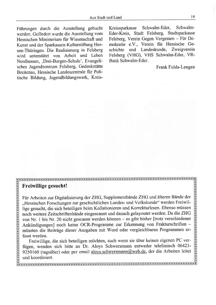 Für Arbeiten zur Digitalisierung der ZHG, Supplementbände ZHG und älteren Bände der „Hessischen Forschungen zur geschichtlichen Landes- und Volkskunde" werden Freiwillige gesucht, die sich beteiligen beim Kollationieren und Korrekturlesen. Ebenso müssen noch weitere Zeitschriftenbände eingescannt und danach gelayoutet werden. Da die ZHG von Nr. 1 bis Nr. 20 nicht gescannt werden können - es gibt bisher [trotz verschiedener Ankündigungen] noch keine OCR-Programme zur Erkennung von Frakturschriften - müssten die Beiträge dieser Ausgaben mit Word oder vergleichbaren Programmen erfasst werden.